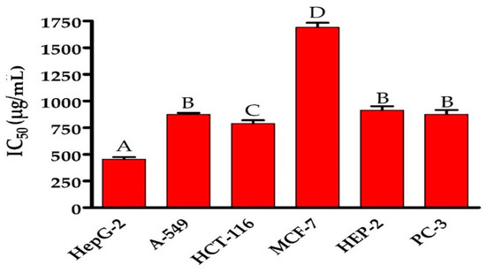 As illustrated in Figure 6 and Figure 7, the impact of various concentrations of EPSR5 on the % viability of several cell line types, including A-549 (adenocarcinoma human alveolar basal epithelial cells), HepG-2 (hepatocellular carcinoma), HCT-116 (human colon cancer cell line), MCF-7 (human breast cell line), HEP-2 (human Epithelioma-2), and PC-3 (prostate cancer cell line), were displayed according to Masamune et al.: each cell type was put in a 96-multi-well plate with a cell concentration of 1 × 104 in 100 µL of growth medium per well, and the assay was executed. The highest (1691.00 ± 44.20 µg/mL) and lowest (453.46 ± 21.80 µg/mL) IC50 of EPSR5 for cell lines were reported in MCF-7 and HepG-2, respectively. In all the studied cell lines, gradual increase in % viability by decreasing the concentration of EPSR5. As compared to the corresponding controls, the % viability of most cell lines started to decline significantly at the level of 125 µg EPSR5/mL and continued to decline gradually by increasing the concentration. Cell viabilities were calculated according to the following formula: