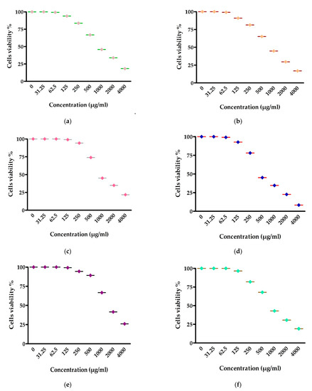 To evaluate the cytotoxicity of EPSR5, different cell lines were used, including human liver cancer cell line (HepG2), adenocarcinoma human alveolar basal epithelial cells (A-459), human colon cancer cell line, human breast cancer cell line (MCF-7), Human Epithelioma-2 (Hep-2), and PC-3 cells (human prostate carcinoma cells). The IC50 for different cell lines were compared to that of cisplatin as a reference drug [52,53]. Each cell type was cultured in a 96-multi-well plate with concentration of 1 × 104 in 100 µL of growing medium per well. Following 24 h, the cells were subjected to EPSR5 at several concentrations (0, 31.25, 62.5, 125, 250, 500, 1000, 2000, and 4000 μg/mL), but the control cell lines were treated with DMSO. The numbers of alive cells were determined after the plates were incubated in a humid chamber with 5% CO2 at 37 °C for a day [54]. The medium was eliminated, and then the cells were stained with 1% crystal violet dye that separated after 30 min of incubation, and the wells were rinsed with water. Subsequently, 30% glacial acetic acid was applied to the wells, and the plates were stirred on a Microplate reader (TECAN, Inc., Männedorf, Switzerland). Then, absorbance of the wells was measured using a microplate reader at a wavelength of 490 nm (SunRise, TECAN, Inc., Seestrasse, Männedorf, Switzerland). These trials were all carried out in duplicate [55,56,57]. The percent of cell viability was determined via the following formula