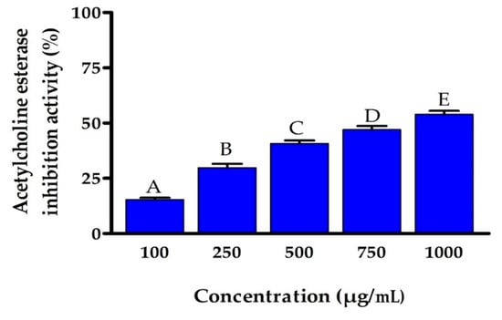 Percentage of inhibition of AChE by different concentrations of EPSR5. Bars represent mean ± SD of triplicate measurements. Bars of the similar letters differ insignificantly (p > 0.05), but those that have different letters differ significantly (p < 0.05).