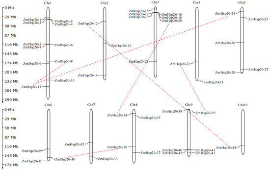 Genome-wide distribution of ZmHSP20 genes on maize chromosomes. The chromosomal location of each ZmHSP20 gene is annotated with the gene name. Chromosome numbers are indicated at the top of each bar. The ZmHSP20 genes present on duplicated chromosomal segments are connected by red dashed lines.