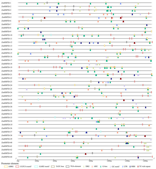 Of 44 ZmHSP20s, 22 members had no intron, 20 members had only 1 intron, and 1 member (ZmHSP20-21) had 6 introns (Figure 2). One gene, ZmHSP20-13, had an ultra-long intron. Seventeen ZmHSP20s did not predict the 5′-UTR and 3′-UTR regions. To explore the potential regulatory and function of ZmHSP20 genes, the cis-acting elements of the ZmHSP20s promoter region involved in hormone stimulus and stress response were analyzed (Figure 3). Ten elements involved in hormone stimulus were detected, including the ABA response element (ABRE), auxin response element (TGA-element, AuxRR-core), GA response element (TATC-box, GARE-motif, and P-box), MeJA response element (CGTCA-motif and TGACG-motif), SA response element (TCA-element and SARE). The cis-elements of drought responsiveness (DRE), anaerobic responsiveness (ARE and GC-motif), low-temperature responsiveness (LTR), wound responsiveness (WUN-motif), and light responsiveness (G-box) were also identified. The number of cis-elements ranged from 4 (ZmHSP20-43) to 39 (ZmHSP20-21). ZmHSP20-3 had 26 cis-elements, of which 16 cis-elements were related to hormone and abiotic stresses, including ABA, auxin, GA, MeJA, drought, low-temperature, and light. The G-box occupied the most genes, which appeared in the promoter regions of 40 ZmHSP20 genes, except ZmHSP20-7, ZmHSP20-22, ZmHSP20-28, and ZmHSP20-42. ABRE presented in 36 genes, of which ZmHSP20-19 contained 10, and ZmHSP20-10 and ZmHSP20-21 contained 8, respectively. In particular, GC-motif appeared 6 times in ZmHSP20-33 but no more 2 in the other genes. Moreover, 23 of ZmHSP20s contained the MBS element, 10 of ZmHSP20s contained the TGA element, and 9 of ZmHSP20 contained the TATC_box. These results indicated that ZmHSP20s were involved in multiple hormonal and abiotic responses.