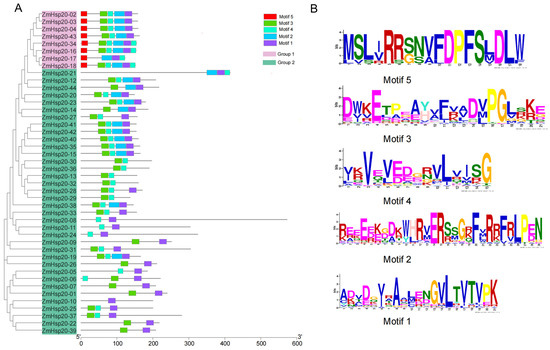 Analysis of the conserved motif in the ZmHSP20s protein. (A) Conserved motifs in ZmHSP20 proteins. The phylogenetic tree of ZmHSP20s was constructed with amino acid sequences using MEGA11 software. Different motifs are presented in different colors. ZmHSP20s were classified into group 1 and group 2 based on the presence or absence of Motif 5. (B) Motif sequences were predicted in the ZmHSP20s protein. The overall height of the amino acid stacks plotted on the y-axis indicates the sequence conservation at a given position, while the height of individual symbols within a stack indicates the relative frequency of a nucleotide base at that position.
