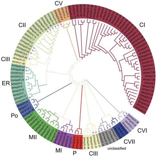 To explore the evolutionary relationship of HSP20s in plants, 44 of ZmHSP20s, 18 of AtHSP20s, 18 of OsHSP20s, and 35 of StHSP20s were subjected to construction of a phylogenetic tree, which was divided into 11 categories according to a previous classification [47,60,61] (Figure 5). These proteins were predicted to localize in 6 organelles, including the cytoplasm and nucleus (C), endoplasmic reticulum (ER), peroxisome (Po), mitochondria (M), and plasma (P). The proteins in the categories of CI, CII, CIII, CV, CVI, and CVII were mainly localized in the cytoplasm and nucleus, proteins in the category of MI and MII were mainly localized in the mitochondria, while proteins in the category of ER, Po, and P were mainly localized in the endoplasmic reticulum, peroxisome, and plasma, respectively. The CI category had the largest number of members, and most of the members in category CII belonged to maize and rice. The category of CV and Po had only four members, with one member of each species. The P category had only three ZmHSP20s (ZmHSP20-5, ZmHSP20-6, and ZmHSP20-7), and the CVII category had three members (AtHSP14.7, StHSP20-27, and StHSP20-28) from dicotyledonous plants, and the CVI category had four members from maize, Solanum tuberosum, and Arabidopsis. The phylogenetic relationship indicated the conservation and difference in HSP20s in plant evolution.
