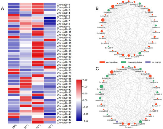 The expression level of ZmHSP20s under heat stress. (A) Heatmap showing the expression levels of ZmHSP20s at 25, 37, 42, and 48 °C based on qRT-PCR. (B) The PPI map of ZmHSP20s was drawn and the genes upregulated at 37 °C are shown in red, and the downregulated genes are shown in green. PPI, protein–protein interaction. (C) The PPI map of ZmHSP20s was drawn and the genes upregulated at 48 °C are shown in red, and the downregulated genes are shown in green.