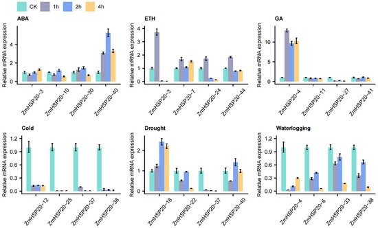 Given that a large number of cis-elements related to hormone and abiotic response occurred in the promoter region of ZmHSP20s, 20 ZmHSP20s were randomly selected to analyze their expression level under three treatments of hormone (ABA, ethylene, and GA) and three abiotic stresses (cold, drought, and waterlogging) (Figure 7). Under the ABA treatment, ZmHSP20-40 was apparently upregulated, while ZmHSP20-3, ZmHSP20-10, and ZmHSP20-30 had minor changes. All four genes (ZmHSP20-3, ZmHSP20-7, ZmHSP20-24, and ZmHSP20-44) were upregulated under 1 h of ethylene treatment, whereas ZmHSP20-3 and ZmHSP20-24 were downregulated under 2 and 4 h of treatment. ZmHSP20-4 had more than 10-fold induction after GA treatment, while ZmHSP20-27 was reduced by GA. Cold stress strongly restricted the expression of four genes (ZmHSP20-12, ZmHSP20-25, ZmHSP20-37, and ZmHSP20-38), and the expression restriction of ZmHSP20-4, ZmHSP20-6, ZmHSP20-33, and ZmHSP20-38 was different under waterlogging stress. Furthermore, ZmHSP20-18 were upregulated after 2 and 4 h of drought stress, whereas ZmHSP20-37 was strongly limited. These results indicated that the members of ZmHSP20s play different roles in different stimuli.