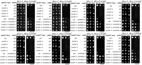 The binding of ZmHSFs with the promoter of ZmHSP20s using the yeast-one-hybrid experiment. The p53 represents the positive control; SD, synthetic dropout medium; L, leucine; T, tryptophan; H, histidine; 3-AT, 3-amino-1,2,4-triazole.