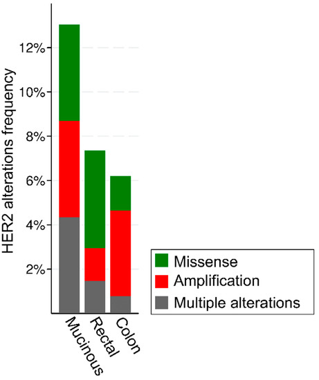 The analysis of publicly available genomic datasets shows that the frequency of HER2 alterations in CRC ranges from ~6% of colon adenocarcinomas to ~7.5% of rectal carcinomas, with a particularly high frequency in the mucinous histological subtype (Figure 1). Of note, the frequency of alteration types, namely gene amplifications and missense mutations, is heterogeneous based on the anatomical site.