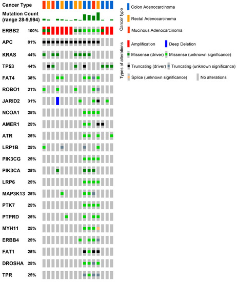 Recurrent genomic alterations in colorectal carcinomas with HER2 alterations. Oncoprint visualization of the most frequently mutated cancer genes in colorectal carcinomas harboring HER2 amplification, mutations, or both types of alterations. TGCA Firehose Legacy series (16 samples) from https://www.cbioportal.org/, accessed on 11 August 2022.