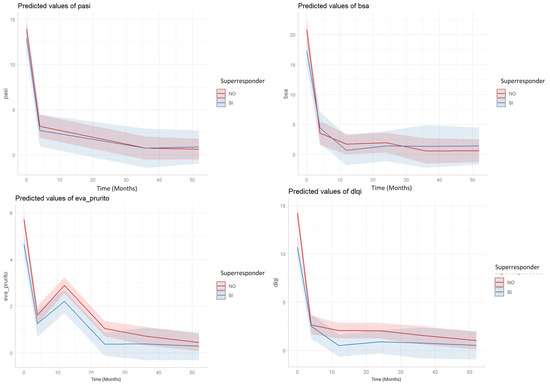 Figure 1 shows the results of the longitudinal regression models that evaluated the temporal evolution of the PASI, BSA, VAS-pruritus, and DLQI variables, depending on whether or not the patients are super-responders.