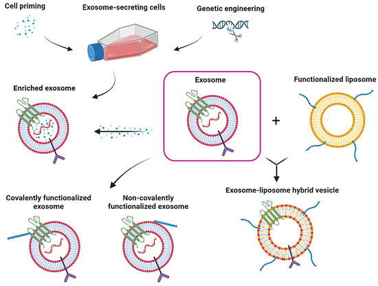 The functionalization of exosomes with different molecules such as antibodies or other therapeutic components could significantly increase their homing capacity and therapeutic effects [51,82]. In this way, different strategies for exosome functionalization focus on exosome surface modification and the enrichment/encapsulation of therapeutic agents (Figure 1) [102,103].