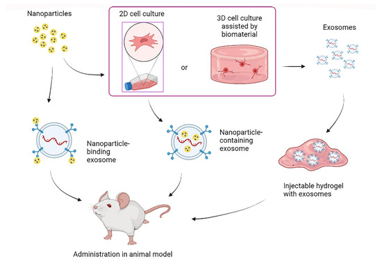 Although to a lesser extent, small nanoparticles have also been employed to assist exosome release, especially in theragnostic applications [153]. For this purpose, different methods have been employed to encapsulate small-sized nanoparticles in exosomes, and in the same way, it has been previously described for the enrichment of exosomes. Among these strategies are simple mixing, electroporation, sonication, and culturing of the secretory cells in contact with the nanoparticles, the latter being the most successful [154,155]. On the other hand, coating exosomes with nanoparticles has been shown to offer multiple advantages over exosome therapy. For example, Wang et al. prepared biotin-functionalized exosomes loaded with doxorubicin, coated with magnetic nanoparticles conjugated to molecular beacons with microRNA-21. The obtained modified exosomes were visible through infrared-responsive molecular imaging and were capable of gene silencing, drug release, and selectively promoting tumor cell death [156]. Thus, using nanoparticles is an option to confer multifunctions to exosomes and increase their therapeutic potential.