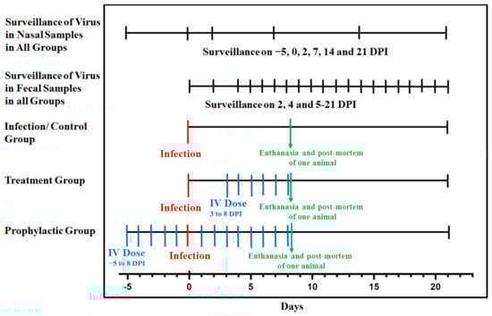 Fecal and nasal swab sampling was performed to determine the shedding of SARS-CoV-2 through these routes. All monkeys of groups A, B, C and D were anesthetized for nasal sampling. Nasal sampling was performed five times during the whole experiment: firstly at 0 day before the infection and then at 2 DPI, 7 DPI, 14 DPI, and 21 DPI from all monkeys of groups A, B, and C. Fecal samples were collected daily from day 0 to 21 DPI. The experimental design for A, B and C groups is given in Figure 1.