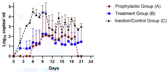 Longitudinal comparison of average fecal viral load of experimental and control groups.