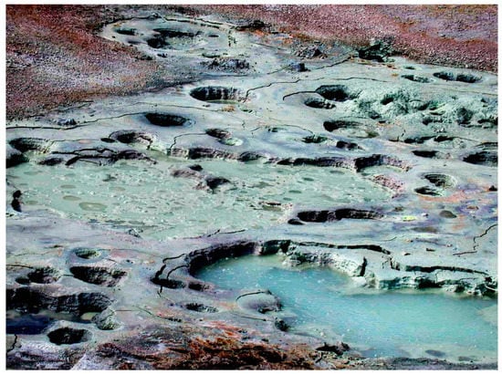 Another meaning of messiness refers to environments that incorporate multiple biological and non-biological compounds [1,2,3]. An example is Bumpass Hell, a hydrothermal site on the Mount Lassen volcano in northern California (Figure 1). The image shows extensive deposits of clay, a common mineral in hydrothermal pools associated with volcanism. The pool is acidic, with pH 3, due to sulfur dioxide dissolved in the water, and the temperature is maintained at 91 °C by residual heat from the underlying magma that powered the eruption. It seems improbable that life could begin in such conditions, which, yet, are ubiquitous in volcanic regions of today’s Earth and presumably on the prebiotic Earth 4 billion years ago.