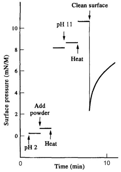 Now we can consider an example demonstrating how the surfactant effect can resolve a complex system. The Murchison meteorite is a mixture of silicate mineral grains with approximately 0.1% by weight of soluble organic compounds that include monocarboxylic acids, amino acids, alcohols, polycyclic aromatics such as pyrene and fluoranthene and even some purines such as adenine. Figure 2 shows a result reported by Mautner et al. [13] in which 20 mg of Murchison powder in 2 mL aqueous buffer was heated briefly to 100 °C at low and high pH ranges. The initial surface pressure was near zero mN/m at room temperature but increased dramatically to 8.1 mN/m when the powder was heated at pH 2, then increased further to 10.3 mN/m when heated at pH 11. The heat allowed small amounts of surface-active compounds to escape from the mineral powder and form a monolayer at the air–water interface. This represents a purification of the amphiphilic compounds by simply heating the original mixture in an aqueous solution. When the surface was cleaned, the surface pressure decreased but then rapidly increased as more surfactant molecules migrated to the interface and formed a monolayer.