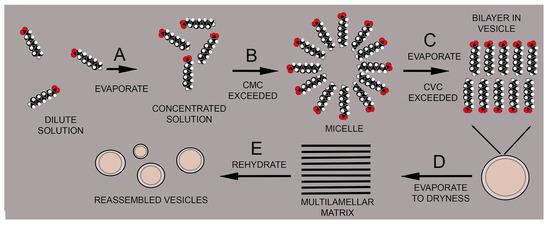 Figure 3 illustrates how an increasing concentration can drive the self-assembly of amphiphilic compounds into membranous compartments. The amphiphile is decanoic acid, a monocarboxylic acid with a 9-carbon hydrocarbon chain and a carboxyl head group. In a dilute solution, the acid is present as individual molecules dissolved in an aqueous phase (A). If the concentration increases, for instance by evaporation, at some point the critical micelle concentration (CMC) is exceeded, and micelles begin to form (B). When the critical vesicle concentration (CVC) is exceeded, the micelles fuse into vesicles bounded by bilayers (C). At the highest concentration near dryness, the vesicles fuse into a multilamellar matrix (D), but then reassemble into vesicles upon rehydration (E).
