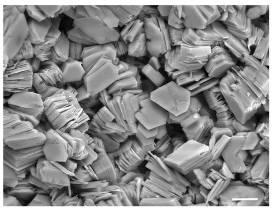 Scanning electron micrograph of clay crystals. The bar corresponds to 10 μm, equivalent to the diameter of a human red blood cell. Photograph courtesy of Evelyne Delbos, the James Hutton Institute.