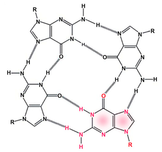Guanine monophosphate assembles into a quadruplex structure stabilized by hydrogen bonding, indicated by dashed lines. The R groups represent the ribose phosphates linked to the guanine by N-glycoside bonds. One of the guanines is indicated by red fonts.