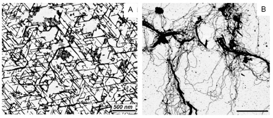 Linear strands of stacked guanosine monophosphate quadruplexes are shown in (A). The strands assemble when a mixture of GMP and CMP is dried on a freshly cleaved mica surface at room temperature, but CMP is excluded when the GMP forms quadruplexes aligned with the crystalline surface of the mica substrate. A different result occurs if the mixture is exposed to three wet–dry cycles at 80 °C (B). Instead of linear crystals, long strands of apparent polymers emerge, presumably composed of GMP and CMP linked by ester bonds [23].