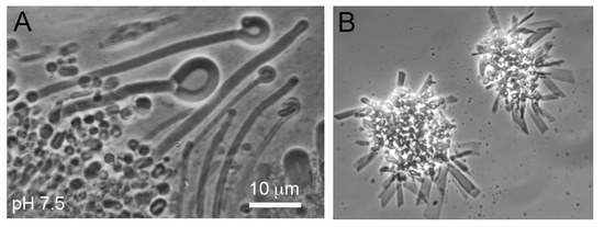 Hydrothermal fields such as those illustrated in Figure 1 are accessible prebiotic analogue sites which can be used to test the assumption that laboratory simulations represent processes and reactions expected to occur 4 billion years ago. A few such tests have been performed. For instance, Milshteyn et al. [28] asked whether membrane-bounded vesicles could assemble in hot spring conditions. Water samples were taken from Yellowstone hot spring pools at acidic and neutral pH ranges. Because contemporary membrane lipids such as phospholipid and cholesterol are products of metabolism, neither would have been available on the prebiotic Earth. Therefore a 1:1 mole ratio mixture of 12-carbon lauric acid and its monoglyceride was used to model the kinds of amphiphiles likely to be present. It was observed that vesicles readily formed in the hot spring water but not in seawater (Figure 7) because divalent cations of Ca2+ and Mg2+ caused the fatty acid to crystallize.