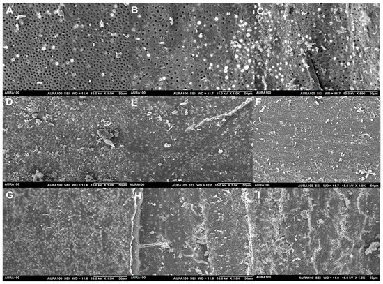 Illustrative SEM samples of each group (original magnification 1000×): incorporation of EDTA at coronal third level (A); inclusion of EDTA at mid-root level (B); addition of EDTA at the apical third level (C); Thymoquinone irrigated-coronal third level (D); mid-root level irrigated by Thymoquinone (E); Thymoquinone irrigation at the apical third level (F); water irrigation at the coronal third level (G); mid-root level irrigated water (H); water irrigation at the apical third level (I).