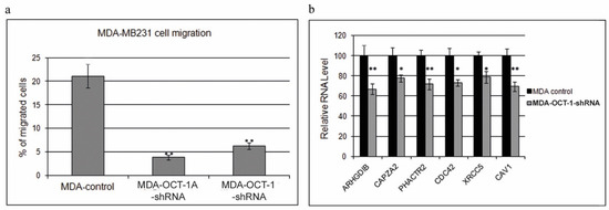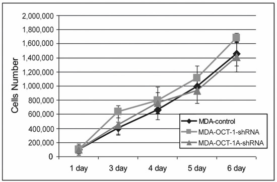 3.2. Knockdown of the Total OCT-1 or Its OCT-1A Isoform Inhibits Breast Cancer Cell Migration and Decreases the Expression of Human Invasion and Metastasis Genes but Does Not Affect Cell Growth Rates