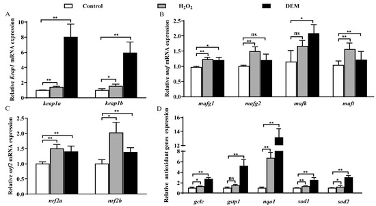 H2O2/DEM induced the activation of the Keap1/Nrf2 signaling pathway and the transcription of target genes. The changes in the relative mRNA expression of (A) keap1a and keap1b, (B) sMaf family genes, (C) nrf2a and nrf2b, (D) antioxidation-related genes were analyzed before and after treatment. n = 30, ** p < 0.01, * p < 0.05, ns p > 0.05, mean ± SEM.