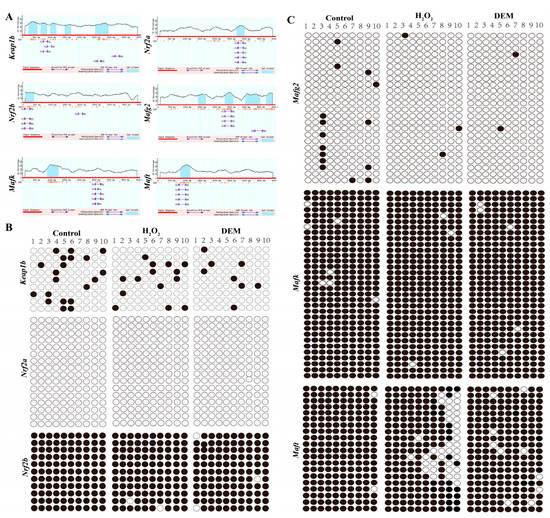 Nine groups were designed, including E3 water control, 1 mmol/L H2O2, 100 µmol/L DEM (Diethyl Maleate), E3 water +3 µmol/L decitabine, 1 mmol/L H2O2 + 3 µmol/L decitabine, 100 µmol/L DEM + 3 µmol/L decitabine, E3 water +3 µmol/L azacitidine, 1 mmol/L H2O2 + 3 µmol/L azacitidine, and 100 µmol/L DEM + 3 µmol/L azacitidine for 6 h at 120 hpf. Next, the methylation of the CpG island in the maft promoter region was tested under different conditions. It was found that the rate of methylation in the E3 water group was 99%. The rate of methylation is 90% after E3 + decitabine treatment, and the rate of methylation is 87.5% after E3 + azacitidine treatment. Compared with the control group, decitabine and azacitidine significantly reduced the level of the methylation of the CpG island in the maft promoter region, indicating that both inhibitors effectively inhibited the maft promoter region methylation. The rate of methylation in the H2O2 group was 83.5%, the rate of methylation in the H2O2 + decitabine treatment was 74.5%, and the rate of methylation in the H2O2 + azacitidine treatment was 72.5%. Compared with the control group without inhibitors, the degree of the maft promoter region methylation was reduced after decitabine and azacitidine treatment, indicating that H2O2 had a synergistic effect with the two inhibitors in demethylation. The rate of methylation in the DEM group was 94%, the methylation rate was 85.5% after DEM + decitabine treatment, and the methylation rate after DEM + azacitidine treatment was 89%. Compared with the control group without inhibitors, the maft promoter region methylation was reduced after decitabine and azacitidine treatment, indicating that DEM and the two inhibitors had a synergistic effect on demethylation. The demethylation effect was shown in Figure 3. Each cycle is a CpG in the DNA sequence represented by either a closed circle (methylated cytosine) or an open circle (unmethylated cytosines). Each row of CpG represents one colony sequenced, with a total of 10 positive clones. The above results suggest that H2O2 and DEM cooperate with decitabine and azacitidine to promote the demethylation of the maft promoter.