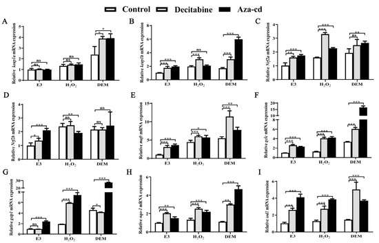 The expressions of the Nrf2/ARE signaling pathway-related genes and target genes under different stimuli after the addition of decitabine and azacytidine (A) keap1a, (B) keap1b, (C) nrf2a, (D) nrf2b, (E) maft, (F) gclc, (G) gstp1, (H) nqo-1, (I) sod1. n = 30, *** p < 0.001, ** p < 0.01, * p < 0.05, ns p > 0.05, mean ± SEM.