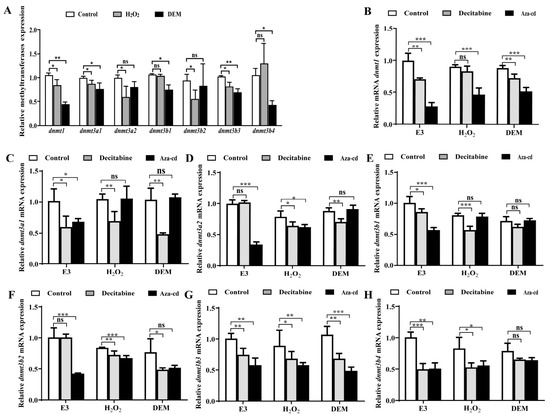 Analysis of methyltransferase expression (A) after H2O2/DEM treatment, after methyltransferase inhibitors treatment, analysis of the expression of (B) dnmt1, (C) dnmt3a1, (D) dnmt3a2, (E) dnmt3b1, (F) dnmt3b2, (G) dnmt3b3, (H) dnmt3b4. n = 30, *** p < 0.001, ** p < 0.01, * p < 0.05, ns p > 0.05, mean ± SEM.