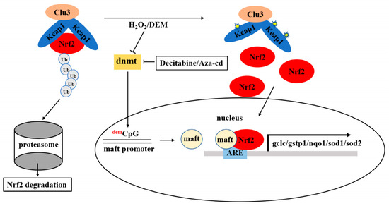 Almost all cancers have abnormal DNA methylation [12,13]. DNA methylation studies of zebrafish are rapidly emerging in the field of epigenetics because of the economic and ethical considerations involved in epigenetic studies using rodent models [14]. In mammals, DNA methylation is modeled under embryonic development and certain physiological and pathological conditions and is catalyzed by DNA methyltransferase [15]. Zebrafish have Keap1 and Nrf2, which are homologous to mammals [16]. Using zebrafish as the research object, the regulation of the Nrf2/ARE signaling pathway and the mechanism leading to related diseases can be further studied [17]. At present, how this signaling pathway is regulated by DNA methylation in zebrafish models has not been studied in detail. Therefore, zebrafish is used as a model organism in this study to explore the mechanism of the activation of the Nrf2/ARE signaling pathway induced by H2O2/DEM, as shown in Scheme 1. It was found that the expression of the small Maf family gene maft was regulated by the methylation of its gene promoter region and the activated downstream target gene expression of the Nrf2/ARE signaling pathway. At the same time, methyltransferase inhibitors were used to demethylate the promoter region of maft, which increased the transcriptional expression of maft and promoted the transcription of the downstream target genes of the Nrf2/ARE signaling pathway.