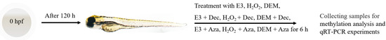 After 120 hpf, 1 mmol/L H2O2 and 100 µmol/L DEM (Diethyl Maleate) solution 4 mL were added for exposure experimentation, respectively. E3 water was used as a control group, cultured at 28 °C for 6 h, and samples were collected for subsequent methylation analysis and qRT-PCR experiments. Nine groups were designed, including E3 water control, 1 mmol/L H2O2, 100 µmol/L DEM (Diethyl Maleate), E3 water +3 µmol/L decitabine, 1 mmol/L H2O2 + 3 µmol/L decitabine, 100 µmol/L DEM + 3 µmol/L decitabine, E3 water +3 µmol/L azacitidine, 1 mmol/L H2O2 + 3 µmol/L azacitidine, and 100 µmol/L DEM + 3 µmol/L azacitidine for 6 h at 120 hpf, as shown in Scheme 2. Next, samples were collected for subsequent methylation analysis and qRT-PCR experiments.