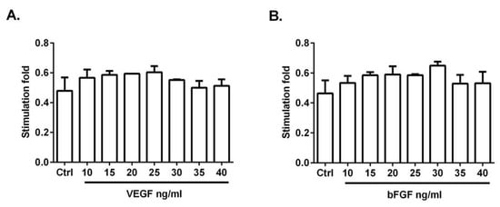 To determine the optimal dose of both factors to promote endothelial cell proliferation, HUVECs were treated with 10–40 ng/mL of VEGF or bFGF for 48 h before the assays. HUVEC proliferation was increased most at 25 ng/mL of VEGF (Figure 2A) and 30 ng/mL of bFGF (Figure 2B). The stimulation fold was not further increased by a higher concentration of both factors. In the following experiments, 25 ng/mL of VEGF and 30 ng/mL of bFGF were used.