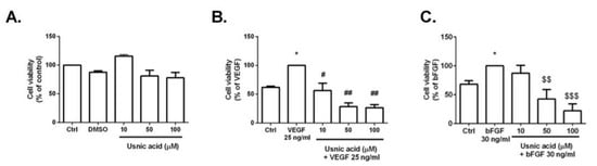 Inhibitory effect of usnic acid (UA) on cell viability. HUVECs cells were treated with vehicle (DMSO) and various concentrations of UA (10, 50, 100 μM) in the absence (A) or presence (B) of VEGF (25 ng/mL) and (C) bFGF (30 ng/mL) for 48 h. Values are means ± SD from three independent experiments (* p < 0.05 versus control; # p < 0.05; ## p < 0.01 versus VEGF alone; $$ p < 0.01; $$$ p < 0.001 versus bFGF alone).