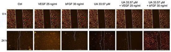 The anti-migratory activity of UA on HUVECs was determined by the scratch wound-healing assay. As seen in Figure 4, the HUVECs migrated into the wounded area after 24 h incubation with VEGF and bFGF. VEGF and bFGF-stimulated HUVECs migration was partially inhibited by UA (33.57 μM) treatment after 24 h. UA alone also inhibited the migration of endothelial cells compared to the control.