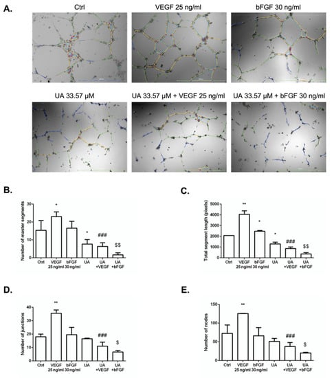 The anti-angiogenic activity of UA was investigated using an endothelial tube formation assay. Tube-like structures harboring branches, segments, junctions, and nodes were observed after culturing HUVECs on Matrigel for 24 h (Figure 5A). The pro-angiogenic factors VEGF and bFGF increased tube formation versus vehicle, as expected. UA was able to significantly inhibit all tested parameters in VEGF- and bFGF-stimulated HUVECs (Figure 5B–E), while UA in the absence of VEGF or bFGF inhibited only the number of master segments and total segment length compared to non-stimulated HUVECs (Figure 5B,C).