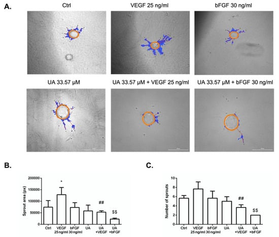 CytodexTM 3 (GE Healthcare, Chicago, IL, USA) microcarrier beads (0.5 g) were swollen in 50 mL DPBS and then autoclaved (121 °C, 20 min). HUVECs were coated on cytodex-3 beads at a density of 4 × 105 cells/40 μL beads and incubated in suspension for 4 h with gentle mixing every 20 min. They were plated overnight on a T25 tissue culture flask. The next day, the suspension was transferred to a 15 mL conical tube and washed three times with 1 mL of M199 + penicillin/streptomycin to remove unattached cells. The cell-covered beads were re-suspended in a 2 mg/mL fibrinogen (Sigma-Aldrich St. Louis, MO, USA) solution containing 0.15 U/mL aprotinin (Sigma-Aldrich). Aliquots were mixed with thrombin (Sigma; 0.625 U/mL), distributed in 12-well plates (150 mL/well), and left to precipitate for 5–10 min. After further incubation (10 min, 37 °C, and 5% CO2), a medium containing 25 ng/mL VEGF or 30 ng/mL bFGF and 33.57 μM of UA was added to cover the precipitate. Bead assays were monitored for 10 days. Images of beads were captured using a microplate CytationTM 3 Cell Imaging Multi-Mode Reader (Biotek, Winooski, VT, USA) and analyzed using automatic WimSprout Image Analysis software (ibidi GmbH, Gräfelfing, Germany).