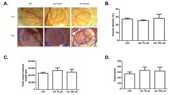 In the preliminary experiments, UA in a concentration of 33.57 μM had no significant effect on CAM vascularization (data not shown). Therefore, we used concentrations of 75 μM and 100 μM, which showed significant differences. UA (75 μM, 100 μM) in the absence of VEGF or bFGF did not reduce the formation of blood vessels, as seen in Figure 7A–D. UA displayed no damage to blood vessels or embryo viability. Symptoms such as hemorrhage, hyperemia, or coagulation were also not observed, which points to no signs of toxicity of UA alone.