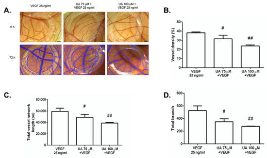 To monitor the effect of UA on VEGF-induced angiogenesis, the vascular formation was supported by the vascular stimulator VEGF. Endogenously supplied VEGF caused marked increased vessel density, total vessel network length, and total branching (Figure S1). UA at concentrations of 75 μM and 100 μM was able to significantly block the VEGF-induced vessel growth in all three parameters (Figure 8B–D). The results also indicate the dose-dependence of the tested substance.