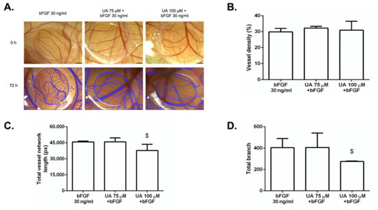 In contrast to VEGF, bFGF affected CAM vascularization more slightly (Figure S3). As shown in Figure 9, UA at the concentration of 100 μM significantly reduced total vessel network length and branch point formation (Figure 9C,D) in the quail CAM when compared with bFGF, whereas we did not observe any difference using 75 μM of UA. Furthermore, vessel density was also unaffected when UA 100 μM was used.