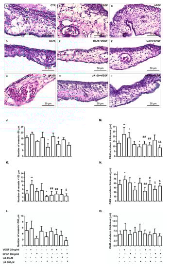 CAM treated with various concentrations of UA in the presence of VEGF (Figure 10E,H) showed inhibition of small and major vessels (Figure 10J,K), with a significant decrease in tissue thickness of ectoderm and mesoderm when compared to the control (Figure 10M,N).