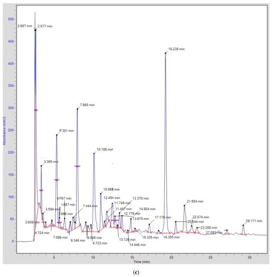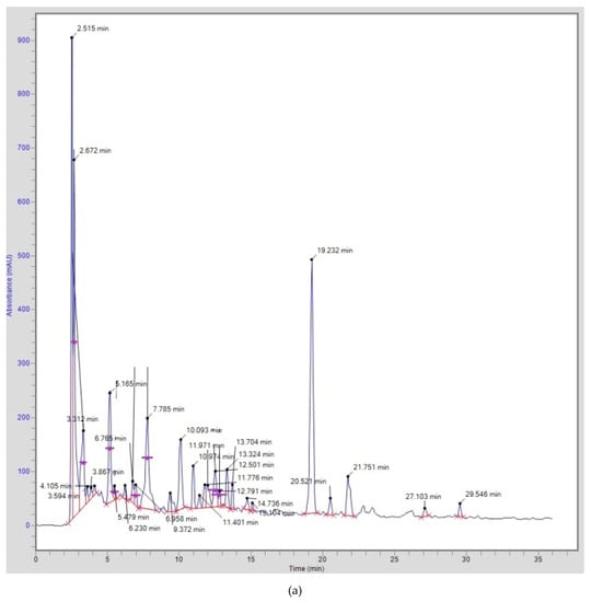 Standard stock solutions of all the phenolic acid and flavonoids available were prepared fresh by dissolving the compounds in methanol (10 mg/mL). Working solutions (0.2–1.0 mg/mL) were prepared and standard curves were constructed by plotting concentrations against peak areas. The extracts were prepared as reported previously and filtered through a 0.45 µm non-pyrogenic filter (Minisart, Satorius Stedim Biotech GmbH, Goettingen, Germany) prior to injection [7].