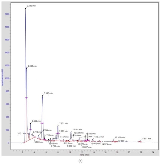 The HPLC analysis was performed with the Perkin Elmer system (Perkin Elmer, Japan) equipped with gradient model binary pump systems, and a UV/Visible detector. The injection mode was manual, and the degasser (DGU-20A5) system was intact. The column oven was installed and equipped with hypersil GOLD C18 column (250 × 4.6 mm internal diameter, 5 mm particle size) (Thermo Fischer Scientific Inc., Waltham, MA, USA) supported with a guard column and a non-linear gradient consisting of solvent A (acetonitrile: methanol, 70:30) and solvent B (water with 0.5% glacial acetic acid). The quantification was based on an external standard method, whereas the analytes were identified by matching the retention times and spiking the samples with the standard.