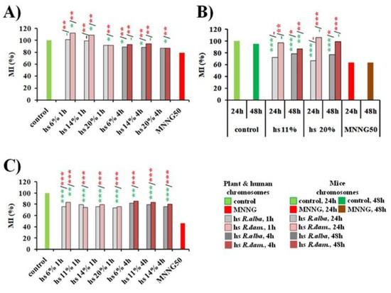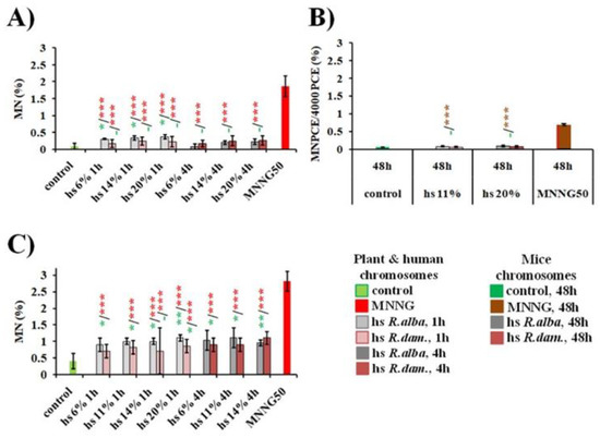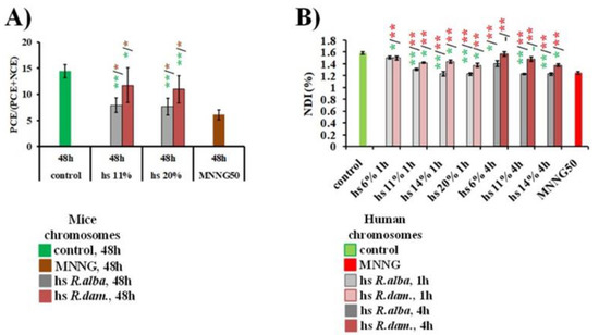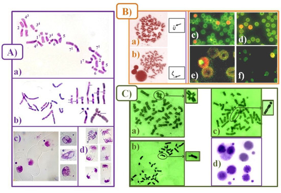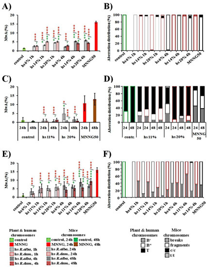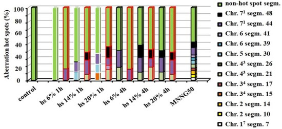 - Jovtchev, G.; Stergios, M.; Schubert, I. A comparison of N-methyl-N-nitrosourea-induced chromatid aberrations and micronuclei in barley meristems using FISH techniques. Mutat. Res./Genet. Toxicol. Environ. Mutagenesis 2002, 517, 47–51. [Google Scholar] [CrossRef]