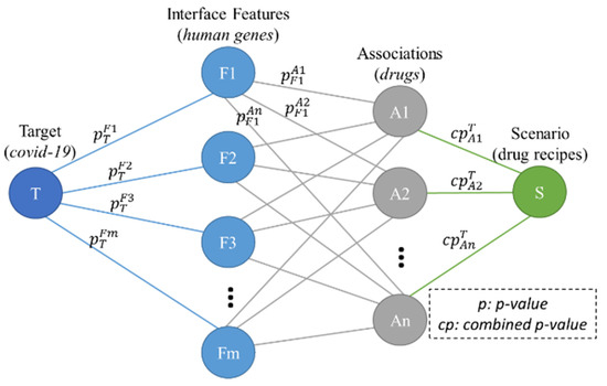 The proposed model consists of forward and backward steps. In the forward step, the proposed p-NA algorithm computes all combined p-values between associations (drugs) and the target (COVID-19). Then, the association with the smallest combined p-value is selected. The combined p-value is calculated based on interface features (human genes). In the backward step, based on the selected association(s), all p-values between interface features and the target are updated. The significance of cooperating associations in each scenario is computed by multiplying the combined p-values of those associations in that scenario. These steps are iterated until that significance becomes less than a threshold (Figure 3).