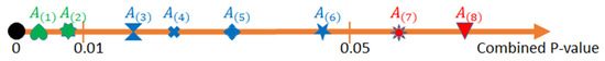 Suppose we have pairs , where is the combined p-value between the association and the target. Let be a reordering of the training data such that . Figure 4 shows an example of the p-NA algorithm. The black circle on the left is the target and the associations are embedded in the axis with their combined p-values with the target. The associations with combined p-values less than 0.01 are shown in green and the others that are less than p = 0.05 are blue . Other ones are shown in red (Figure 4).