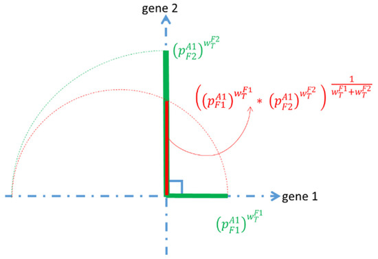 is the p-value between these genes and the association. The weight of gene i is . Rotating the line segment in the direction of gene 1 is shown with a dashed green curve. A circle with its center in the gene 1 line that touches the and rotated line segment of is shown in a red dashed curve. The measure of the combined p-value is shown red line (Figure 5).