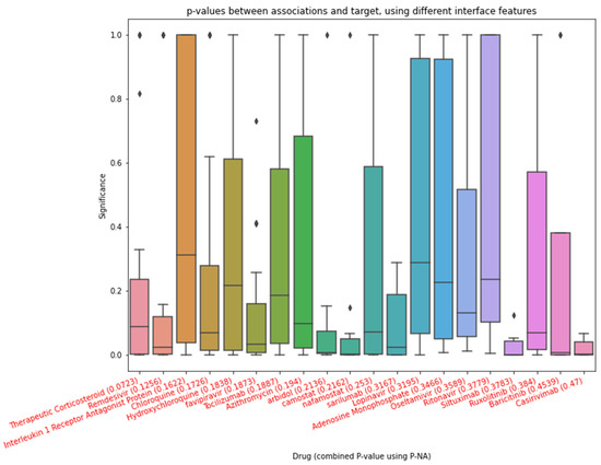 After obtaining the drugs suggested by clinical experts, the human genes affected by COVID-19, we collected all of the p-values between drugs and genes and between COVID-19 and genes. We separated each association and then found the combined p-value using the proposed WGM. The nearest association was then found in the forward step of p-NA. Figure 6 shows the results of p-NA’s forward step for associations in the drug categories.
