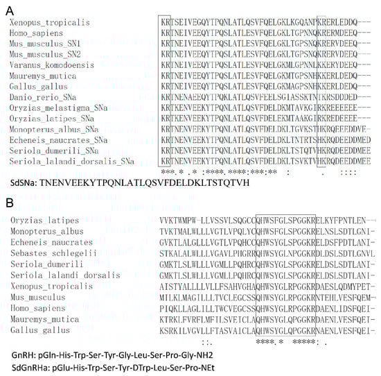 Comparative analysis of the secretoneurin active peptide (SNa) and gonadotropin-releasing hormone (GnRH) protein sequences of multiple species. (A) SNa consists of a conserved 34 amino acids active peptide. (B) GnRH consists of a conserved decapeptide. Accession IDs of secretogranin-2 proteins are listed in Supplemental Table S1 and accession IDs of gonadotropin-releasing hormone proteins are listed in Supplemental Table S2. The * indicates the most conserved amino acids.