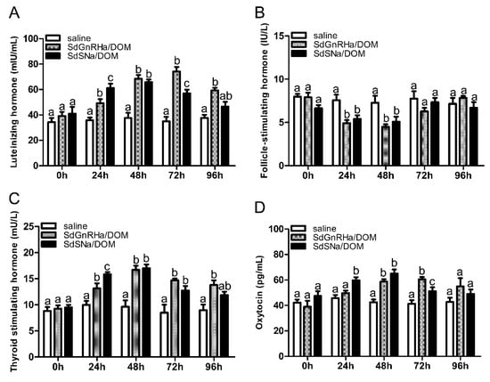 Serum hormone levels of S. dumerili after injection of SdSNa/DOM, SdGnRHa/DOM, and normal saline (n = 6). Serum levels of luteinizing hormone (A) and follicle-stimulating hormone (B) were increased and reduced, respectively, following injection with SdSNa/DOM or SdGnRHa/DOM. Serum levels of both thyroid-stimulating hormone (C) and oxytocin (D) were elevated in response to SdSNa/DOM and SdGnRHa/DOM treatment. The a, b, c indicates the indicate statistically significant differences, p < 0.05.